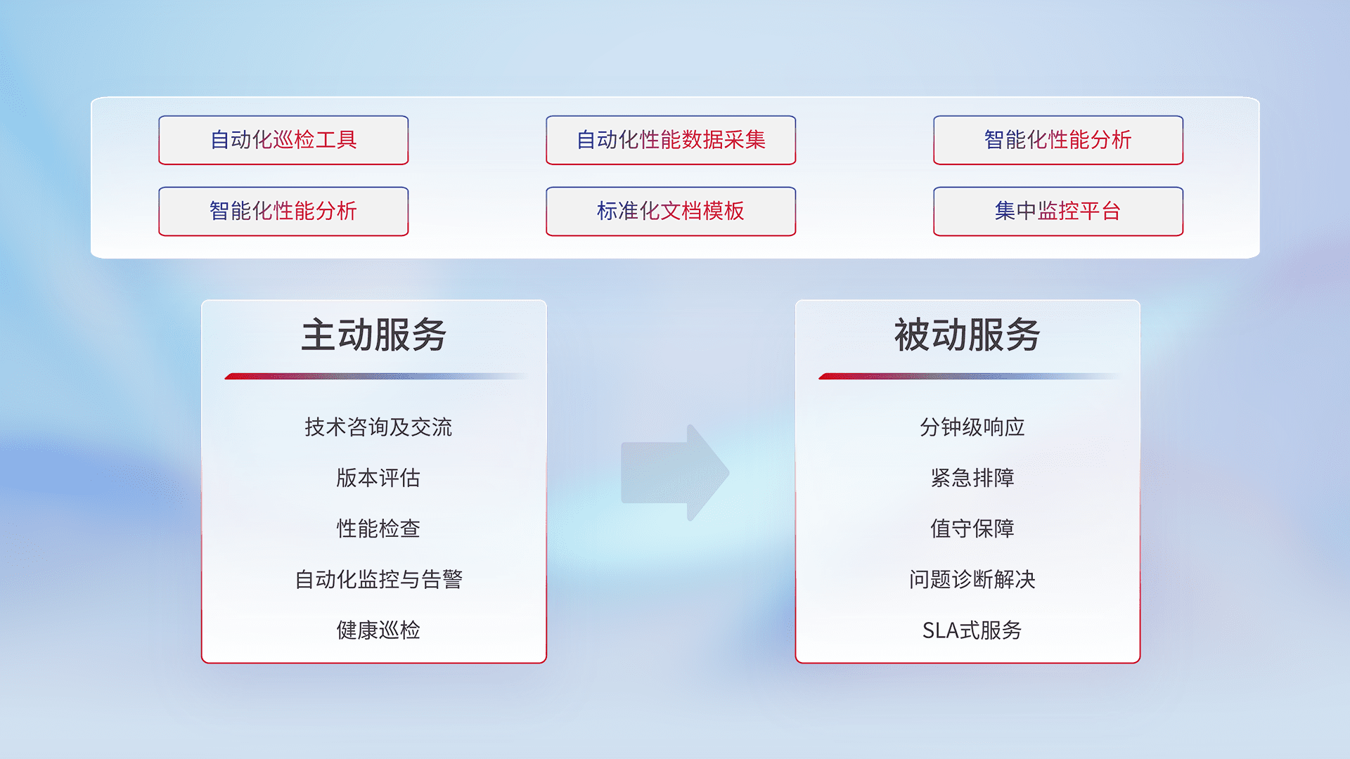 智能化工具和标准化文档,,,保障服务质量,,提供主动服务(包含技术咨询、、、、版本评估、、、、性能检查、、自动化监控与告警、、、、健康巡检)和被动服务包含(分钟级响应、、、紧急排障、、值守保障、、、问题诊断解决、、、SLA服务)。。。
