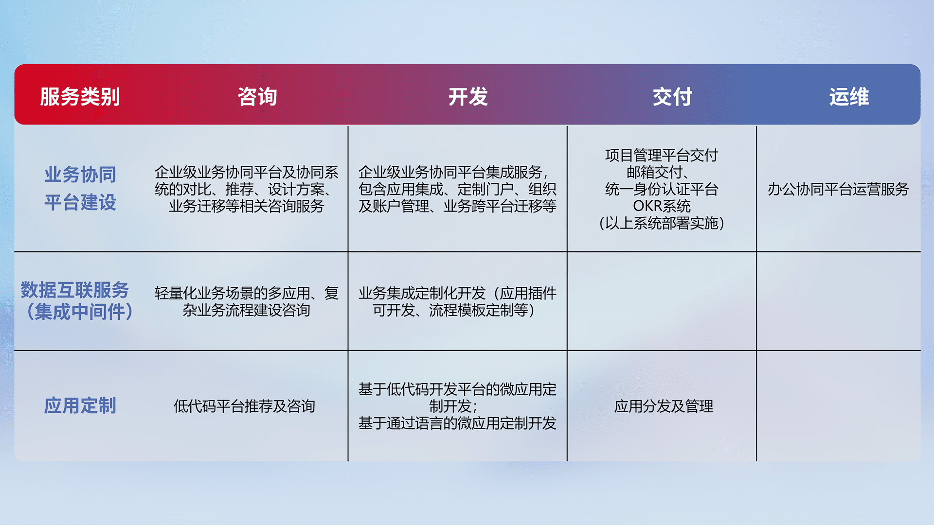 针对钉钉、、、企微、、、IDaas等平台级产品提供产品的规划、、、方案、、、交付、、定制化开发等服务,,实现如统一协同办公、、、、智能客户服务、、、、混合会议管理、、、、智能数据查询、、等业务场景,,,,实现数字化转型。。。